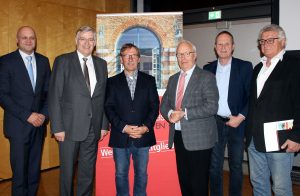 Freude über die Erfolgsbilanz des Freundeskreises Lokschuppen. Von links: VKR-Geschäftsführer Peter Lutz, der Vorstandsvorsitzende der Sparkasse Rosenheim-Bad Aibling Alfons Maierthaler, der Vorsitzende des Freundeskreises Lokschuppen Heinz-Werner Bleyl, der zweite Bürgermeister der Stadt Rosenheim Anton Heindl, der Leiter des Ausstellungszentrums Lokschuppen Dr. Peter Miesbeck und Norbert Lauinger, ehemaliger Geschäftsführer des OVB-Medienhauses und 2. Vorsitzender des Freundeskreises.