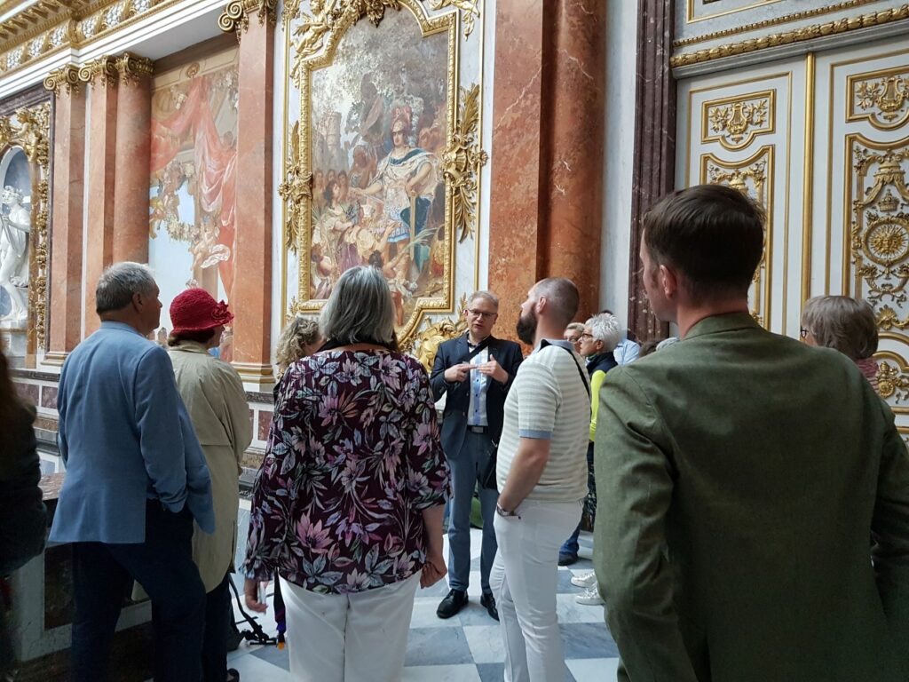 Der Historiker Marcus Spangenberg und die Teilnehmenden der Veranstaltung im Prunktreppenhaus von Schloss Herrenchiemsee.