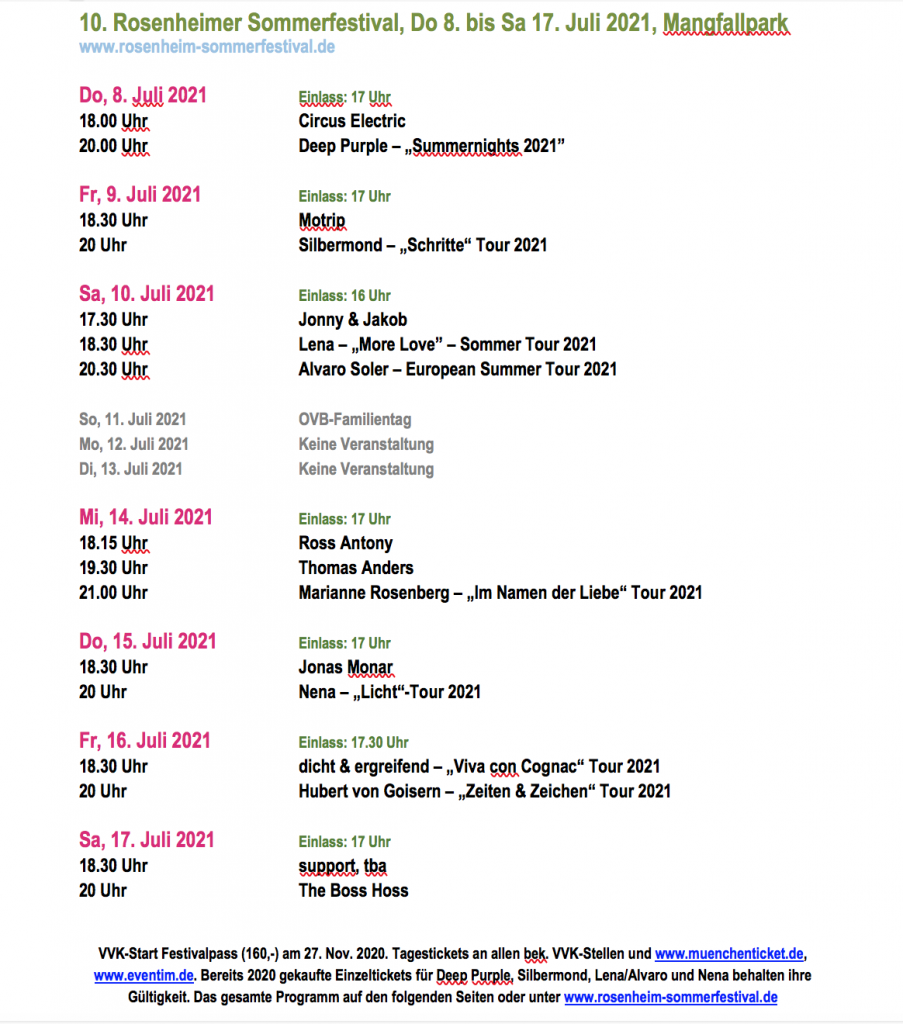 VVK Festivalpass (160,-) ab 27. Nov. 2020 unter www.spk-ro-aib.de. Tagestickets an allen bek. VVK-Stellen und www.muenchenticket.de, www.eventim.de. Bereits 2020 gekaufte Einzeltickets für Deep Purple, Silbermond, Lena/Alvaro und Nena behalten ihre Gültigkeit. Das gesamte Programm auf den folgenden Seiten oder unter www.rosenheim-sommerfestival.de.