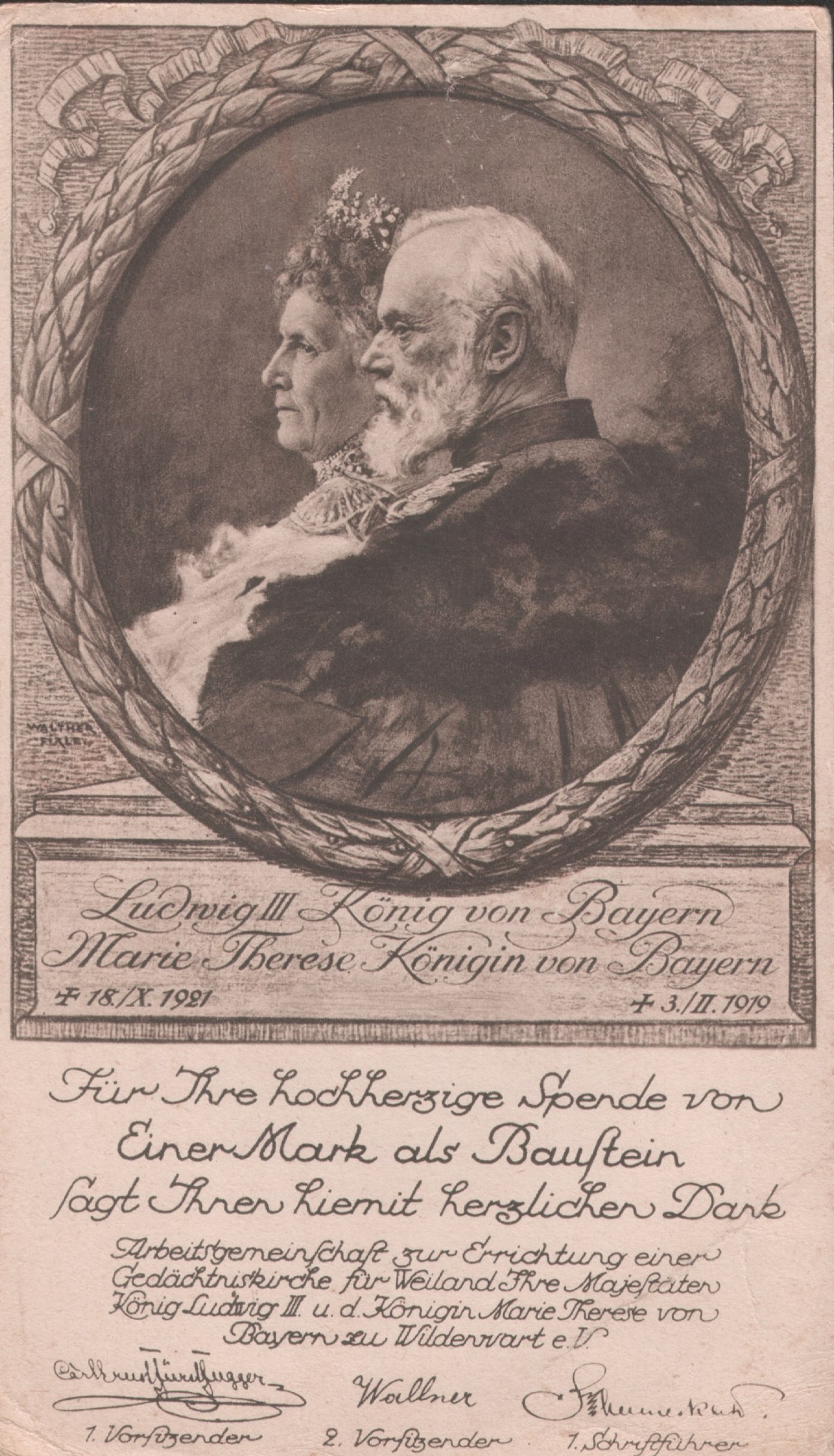 Beitragsbescheinigung für den Bau der Gedächtniskirche in Wildenwart nach dem offiziellen Porträt von Walter Firle zur Goldenen Hochzeit 1918. Diese Bauaktie und viele Postkarten mit dem Königspaar, der Überführung von Wildenwart nach Prien und dem Begräbnis in München sind noch in vielen alten Wildenwarter Häusern vorhanden.