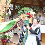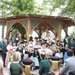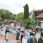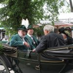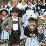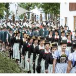 Aufgeteilt in zwei Kirchenzüge, die an der Unterwirtskurve zum Einzug an den Schlossplatz zusammenkamen, bot die 8-reihige Marschordnung der rund 40 Vereine und 14 begleitenden Musikkapellen ein beeindruckendes Bild. Pater Gabriel erwartete die Festgäste am Eingang und spendete den Segen für alle. In seiner Predigt ging er ein auf das Motto des Jubiläums ein “bärig – boarisch-beinand“. „Die Predigt mache heute nicht ich, die macht ihr. Und zwar gemeinsam.“ wünschte sich der Pater. “Bärig, das ist wen etwas toll ist“ wusste er. Zu Boarisch fielen ihm als erstes die typischen Sprachübungen ein, ein Trachtendirndl sagte ein Gedicht auf und berichtete aus Halle/Saale zu kommen und erst ein Jahr in Bayern zu sein. Das aber sehr gerne. Größter Punkt war das „beinand“. Pater Gabriel holte sich dazu zahlreiche Festteilnehmer jeden Alters zum Messepavillon, unterhielt sie mit launigen Worten und alle freuten sich über das bunte beinand. Mitglieder des Trachtenvereins brachten einige sehr persönlich formulierte Fürbitten dar, in den sie um ein gutes Miteinander baten und derer gedachten, die nicht mehr mitfeiern können. Pater Gabriel segnete das neue Fahnenband, das von Vortänzerin Theresa Schneider an der Fahne befestigt wurde. Landrat Siegfried Walch und Gauvorstand Peter Eicher lobten übereinstimmend das große Engagement des Chieminger Trachtenvereins, sowohl in der Vergangenheit durch die langjährige Führung von Bernhard Pletschacher und Georg Hunglinger, aber auch der neuen jungen Vorstandschaft mit Korbinian Maier an der Spitze. Sie lobten den Einsatz für die Bewahrung der Tradition und der bayerischen Kultur. Peter Eicher: „Heimat ist überall. Wir haben unsere Heimat und unsere Kultur, die es zu bewahren gilt. Wir wünschen und auch weiterhin so viele junge Leute, die sich auch die nächsten hundert Jahre so stark engagieren.“ Landrat Siegfried Walch: „Bärig hat viel mit uns und unserer Region zu tun, die uns ausmacht, aber auch mit Gefühl. Boarisch hat auch mit Stolz auf unsere Heimat zu tun. Beinand sein macht unsere Gesellschaft aus, das Zusammenhalten, auch bei den Trachtlern, egal wo man herkommt.“