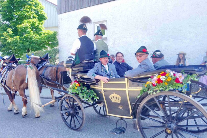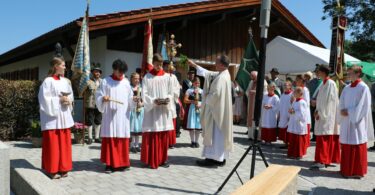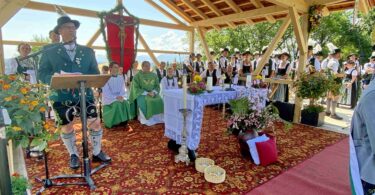 Zuvor sagte Pfarrer Gottfried Grengel vom Pfarrverband Westlliches Chiemseeufer trotz des außergewöhnlich schönen Blickes von der Ludwigshöhe auf den Chiemsee: „Mach mas kurz, es is hoaß!“. Doch ein paar wichtige Botschaften richtete er noch an die große Trachtler- und Besucherschar: „Tracht ist nicht nur ein Gewand, Tracht trägt man auch im Herzen. Erinnern wir uns im Sinne der Vorfahren gerne und Tag für Tag daran, was uns die Heimat und was uns Tracht und Sitte bedeuten“. Und er fügte hinzu: „Ohne Herrgott gibt es keine Tracht, für die Gläubigen ist das Leben ein Fest, das zur Freude geschaffen wurde und was leider von auch jungen Leuten, die sich auf die Straße kleben, vergessen wird“. Mit dem Wissen, dass bei gutem Willen jedes Problem zu lösen ist, leitete Pfarrer Grengel zum Glaubensbekenntnis über. Die musikalische Gestaltung der Feier mit dem von der Familie von Ehrenvorstand Hans Pichler zur Verfügung gestellten Stadel übernahmen die Festmusikkapelle Wildenwart sowie die Rimstinger Sänger. Vereinsvorstand Matthias Feichtner sowie Schirmherr und Bürgermeister Andreas Fenzl dankten in ihren Ansprachen der großen Vereins- und Gemeinde-Familie für den enormen Vorbereitungs-Einsatz und für das Zustandekommen des Gemeinschaftserlebnisses, das mit dem Festzug durch den Ort Rimsting hin zum geselligen Beisammensein im Festzelt fortgesetzt wurde.