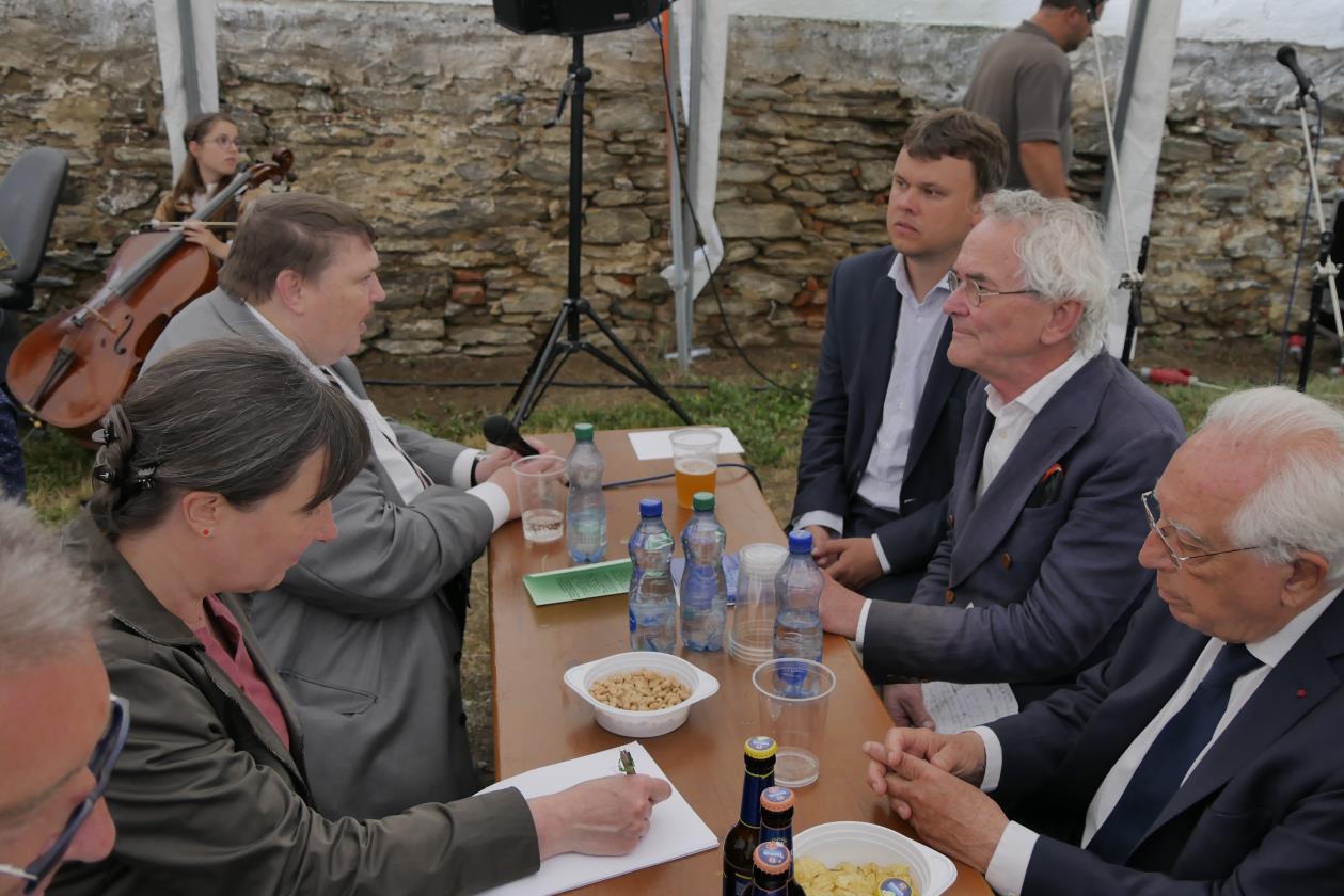 Böhmisches Volksfest vor der Schloßruine von Ronsperg: v.r.n.l. der internationale Paneuropa-Präsident Alain Terrenoire, der tschechische Paneuropa-Präsident Marian Svejda, Bürgermeister Martin Kopecky sowie Bernd Posselt und Stephanie Waldburg von der Paneuropa-Union Deutschland. (Foto Stefan Zwinge)
