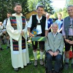 Am Morgen zum Jubiläumssonntag weckte ein wolkenloser Bergsommer die Gäste und schon bald trafen auch die ersten Bergwanderer ein. Zur Bergmesse versammelten sich viele Besucher auf der Wiese unterhalb des Brünnsteinhauses (sh. Foto 3709) und erlebten eine kurzweilige Messfeier, musikalisch umrahmt von einer einheimischen Bläsergruppe und aufrichtig zelebriert von Pater Matthäus aus dem Kloster Reisach. Die Vertreter der Gemeinde Oberaudorf mit zweitem Bürgermeister Alois Holzmaier und der Gemeinde Kiefersfelden mit Bürgmeister Hajo Gruber gratulierten herzlich und überreichten Erinnerungspräsente (sh. Foto 3724, v.li. Pater Matthäus, Franz Knarr, Kiefersfeldens BM Hajo Gruber und Alois Holzmaier, 2. BM Oberaudorf ). Dann füllte sich der Biergarten und die gute Organisation zur Versorgung mit Speisen und Getränken aus Küche und Keller sorgte für beste Stimmung. Bis zum frühen Abend hörte man nur fröhliche Stimmen, musikalisch pfiffig von jungen Musikanten unterhalten (sh. Foto 3727). (fxk)