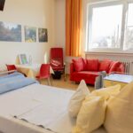 Der großzügige Aufenthaltsraum – selbst ein Klavier und eine Gitarre gibt es hier – lädt zum Verweilen ein und bietet besonders Kindern und Familienangehörigen einen Ort zum Ankommen. Der Umgang mit Krankheit, Sterben und Tod versetzt jeden erst einmal in einen Ausnahmezustand. Speziell für Kinder liegen altersgerechte Bücher auf, die helfen die Situation zu begreifen. Regelmäßig finden auf Station Konzerte statt und die Besuche der Klinikclowns erfreuen die Patienten immer wieder. „Seit kurzem darf ein speziell ausgebildeter Therapie-Hund mit Sondergenehmigung auf die Palliativstation kommen. Sie glauben gar nicht, wie gerne die Patienten den Hund streicheln“ berichtet Pfleger Markus und fügt hinzu: „Wir schauen wirklich, dass wir vieles ermöglichen können“. Selbst das Badezimmer, ausgestattet mit begehbarer Wanne und Whirlpool sowie Handtuchwärmer, erinnert mit der hübschen maritimen Bordürenverzierung eher an ein Urlaubsdomizil. Am Ende des Stationsflures geht es über ein paar Stufen auf die große Terrasse. Draußen angekommen überwältigt einen der Blick in die Ferne, auf die Stadt mit der Nikolauskirche und die heimischen Berge.