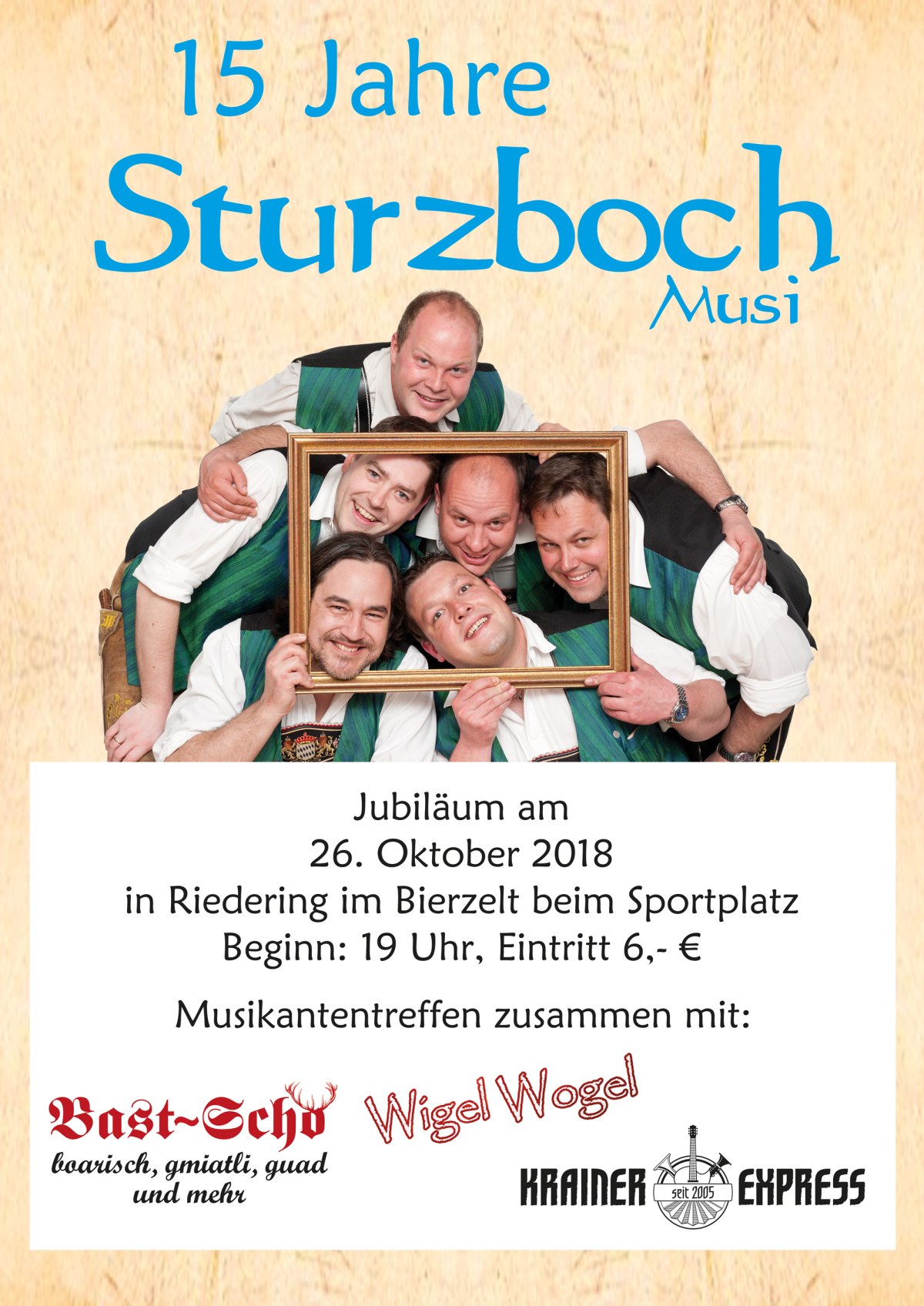 Am kommenden Freitag, 26. Oktober findet ein ganz besonderes Musikantentreffen im beheizten Bierzelt in Riedering (beim Sportplatz) statt. Anlass ist das 15-jährige Jubiläum der Sturzboch-Musi. Als musikalische Freunde sind „Bast-Scho“, „Krainer-Express“ und „Wigel Wogel“ eingeladen. Es beginnt um 19 Uhr. Der Eintritt beträgt 6,- €.