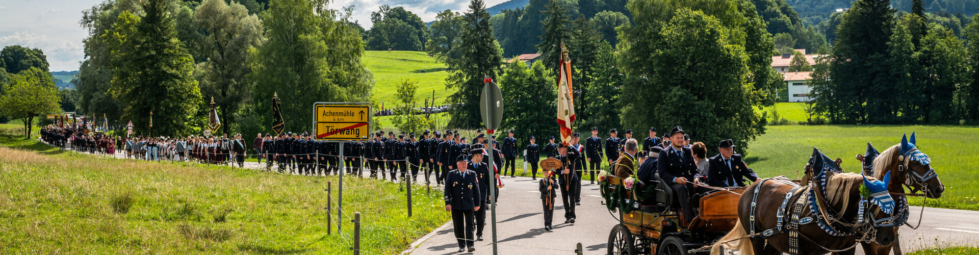 Alle Feuerwehrmänner und -frauen der Samerberger Feuerwehren (Törwang, Grainbach, Roßholzen und Steinkirchen) mit den 3 Bürgermeistern vom Samerberg (1. Bürgermeister Georg Huber, 2. Bürgermeister Christoph Heibler, 3. Bürgermeisterin Christine Eckert), sowie den Tafelträgern und Vereinsfahnen.