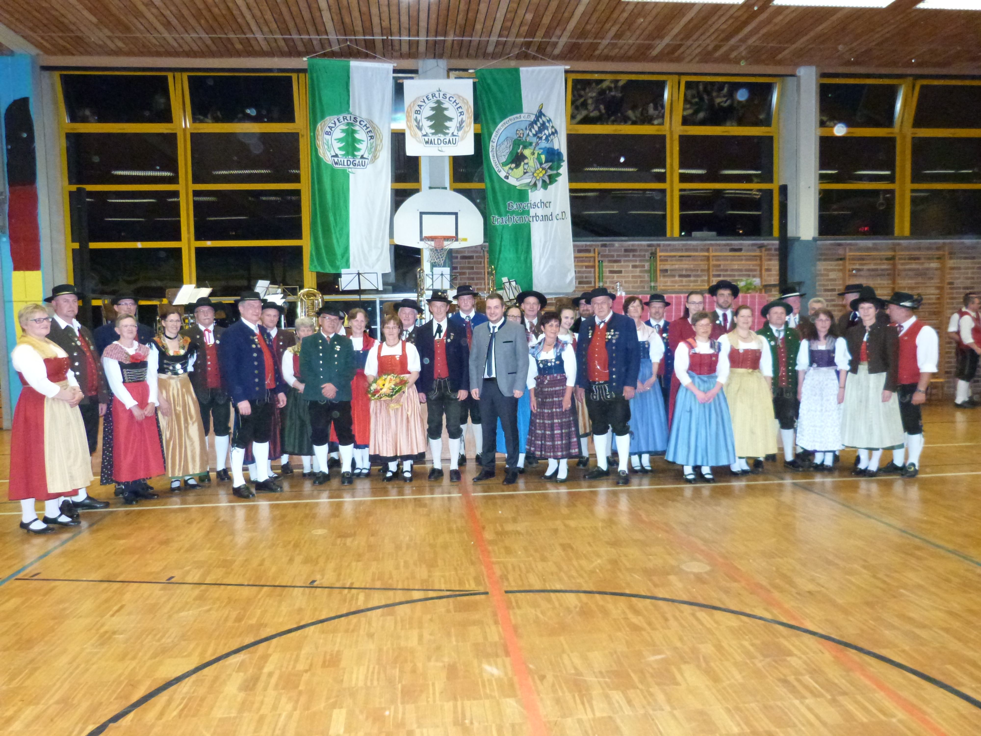 Die neuen Ehrenmitglieder Eugen und Lisbeth Sterl (zehnter v. li.) konnten sich über die Gratulation der Gauführung und der Vortänzerpaare des Bayerischen Waldgaues freuen.