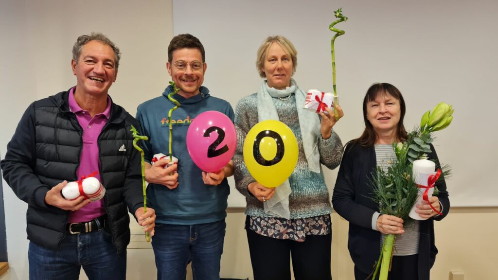 Der Vorstand des Dachverbands Clowns in Clowns in Medizin und Pflege Deutschland e.V. (v.l.n.r Rainer Bormuth, Sven Wolfers, Julia Wiegmann, Elisabeth Makepeace-Vondrak) freut sich über das Verbandsjubiläum