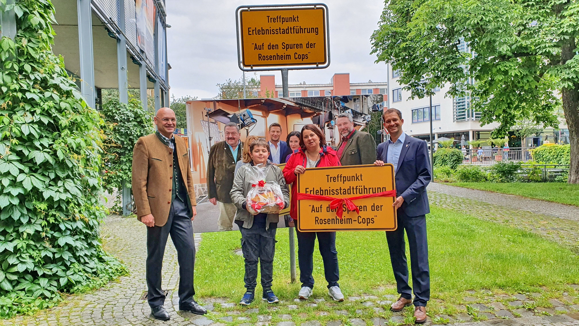 VKR-Geschäftsführer Peter Lutz (links) und Oberbürgermeister Andreas März (rechts) gratulieren glücklichen Gewinnern einer Jubiläumsstadtführung