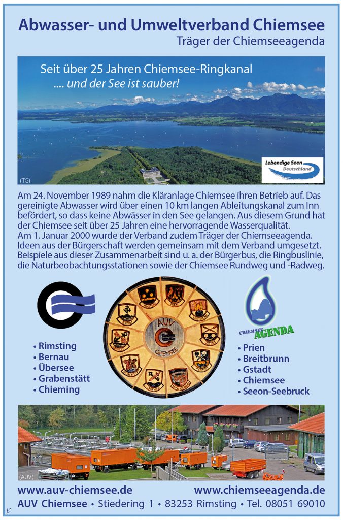 Der Chiemsee-Rund- und Radweg, der Bürgerbus, die Naturbeobachtungs-stationen, die Chiemseeringlinie, die Chiemseekonferenz, der CO2-Rechner, die plastikfreie Chiemsee-Region – die Aufzählung könnte noch weitergeführt werden. Der Umfang und die Vielseitigkeit der Umweltprojekte des Abwasser- und Umweltverbands Chiemsee (AUV) ist beeindruckend. Daran wird nun seit bereits 20 Jahren gearbeitet – denn das „U“ im AUV begeht dieses Jahr seinen „20. Geburtstag“.
