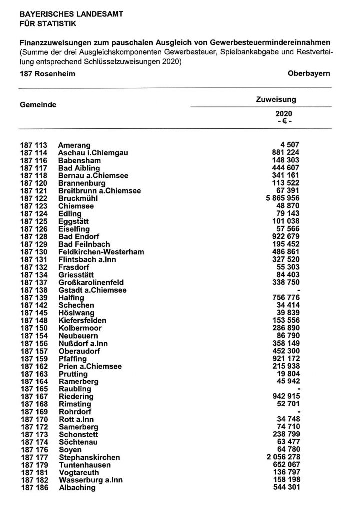 Rosenheim. Landtagsabgeordneter Klaus Stöttner teilt mit, dass die Staatsregierung die teils massiven Gewerbesteuermindereinnahmen aufgrund der Corona-Pandemie zu 100 Prozent ausgleicht. Die Stadt Rosenheim erhält Finanzzuweisungen zum pauschalen Ausgleich von Gewerbesteuermindereinnahmen in Höhe von knapp 2 Millionen Euro. In die Städte und Gemeinden des Landkreises Rosenheim fließen fast 19 Millionen Euro. Bruckmühl (5.9 Millionen Euro) und Stephanskirchen (2.1 Millionen Euro) erhalten die höchsten Zuweisungen.