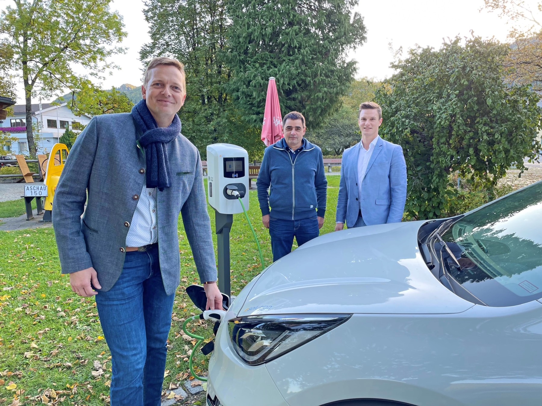Bürgermeister Simon Frank, nimmt die erste Ladesäule am Parkplatz vor der Touristinfo mit Aschaus Liegenschaftsbeauftragtem Stefan Aberger und dem Projektverantwortlichen von esolution by maxsolar Florian Scharnagl offiziell in Betrieb (von links).