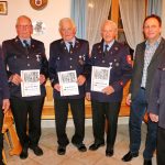 Bericht und Bilder: Heinrich Rehberg – Der Vorstand der Wildenwarter Feuerwehr Michael Ramsl (links) und sein Stellvertreter Alfred Vodermaier (rechts) zeichneten – gemeinsam mit Bürgermeister Daniel Mair (zweiter von rechts) – drei Feuerwehrleute für 60 Jahre Dienst am Nächsten und die Wildenwarter Dorfgemeinschaft aus: Sebastian Spitzl, Josef Kronast und Andreas Freund senior (von links mit Urkunden). Nicht im Bild: Peter Möderl und Ludwig Freund senior.