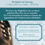 Verkaufslisten sind erhältlich bei Haushaltswaren Mittendorfer, Rosenheimer Str. 19 in Kolbermoor oder bei Wolle und mehr in Bad Aibling, Münchner Str. 6 in Bad Aibling. 10 % vom Verkaufserlös werden zu Gunsten der Jugendarbeit des Trachtenvereins einbehalten.