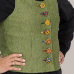- Bunte Posamentenknöpfe und farblich passende handgestochene Knopflöcher machen aus dem klassischen Leibchenschnitt einen echten Hingucker.