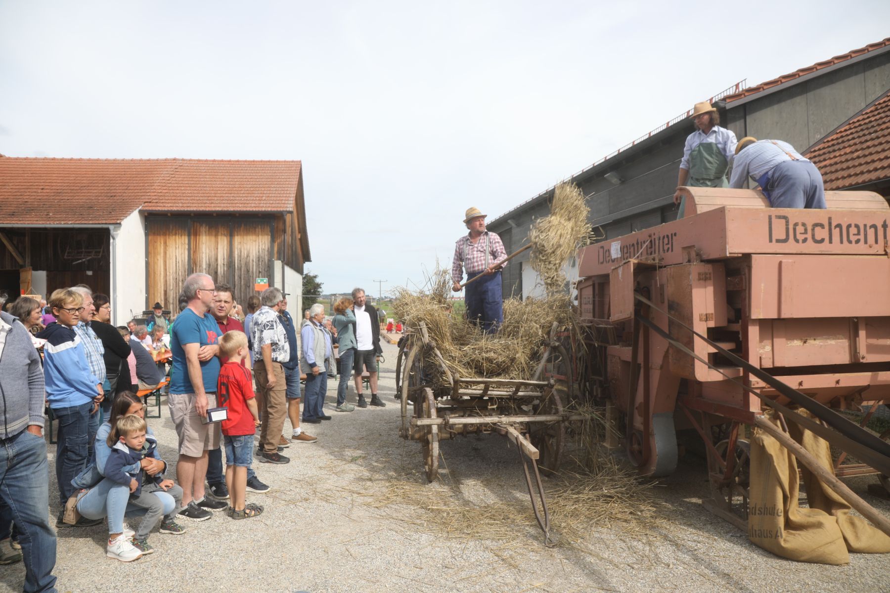 Der Dreschwagendrusch wurde am Sonntag von den Trachtenvereinsmitgliedern laufend vorgeführt und aufgezeigt