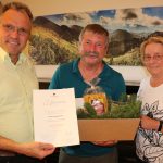 Ilse Goßner (rechts) bedankte sich beim Vorsitzenden der Kolpingfamilie Aschau Johann Berghammer (Mitte) für seine umsichtige Vereinsführung seit 40 Jahren, der Vorsitzende sei der Motor der Kolpingbewegung in Aschau, er wirke neben seiner Tätigkeit als Vorsitzender auch an anderen Stellen im Verein mit, sei es als Fähnrich, als Schriftführer oder als Nikolaus oder als Organisator der Kleidersammlungen. Zusammen mit Pfarrer Paul Janßen (rechts) überreichte sie dem rührigen Vorsitzenden einen kleinen Präsentkorb.