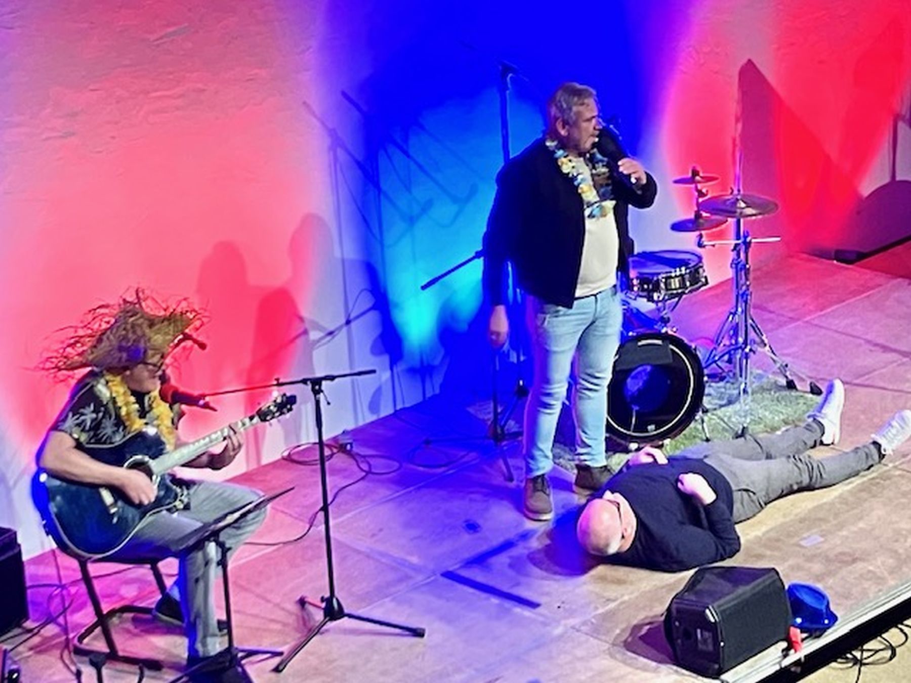 Stefan Schimmel mit Volker Schach an der Gitarre begeisterte ein weiteres Mal mit seinem Witz – hier bei “Staying alive” und einem “wiederzubelebenden” Besucher auf dem Boden.