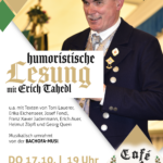 Am Donnerstag, 17. Oktober kommt es im Trachtenkulturzentrum von Holzhausen (Cafe Komod) zu einer besonderen, humoristischen Lesung mit stellvertretendem Landesvorsitzenden Erich Tahedl vom Bayerischen Trachtenverband. Hierzu gibt er schon preis “Ich lese u. a. Texte von  Toni Lauerer, Erika Eichenseer, Josef Fendl, Franz Xaver Judenmann, Erich Auer, Helmut Zöpfl, Georg Queri, das Programm beinhaltet Geschichten aus dem Leben, wie sie Toni Lauerer so trefflich verfasst hat, deftige Sprüche von Josef Fendl und besinnliche Texte von Erika Eichenseer ebenso wie die trefflichen Beiträge von Helmut Zöpfl”.