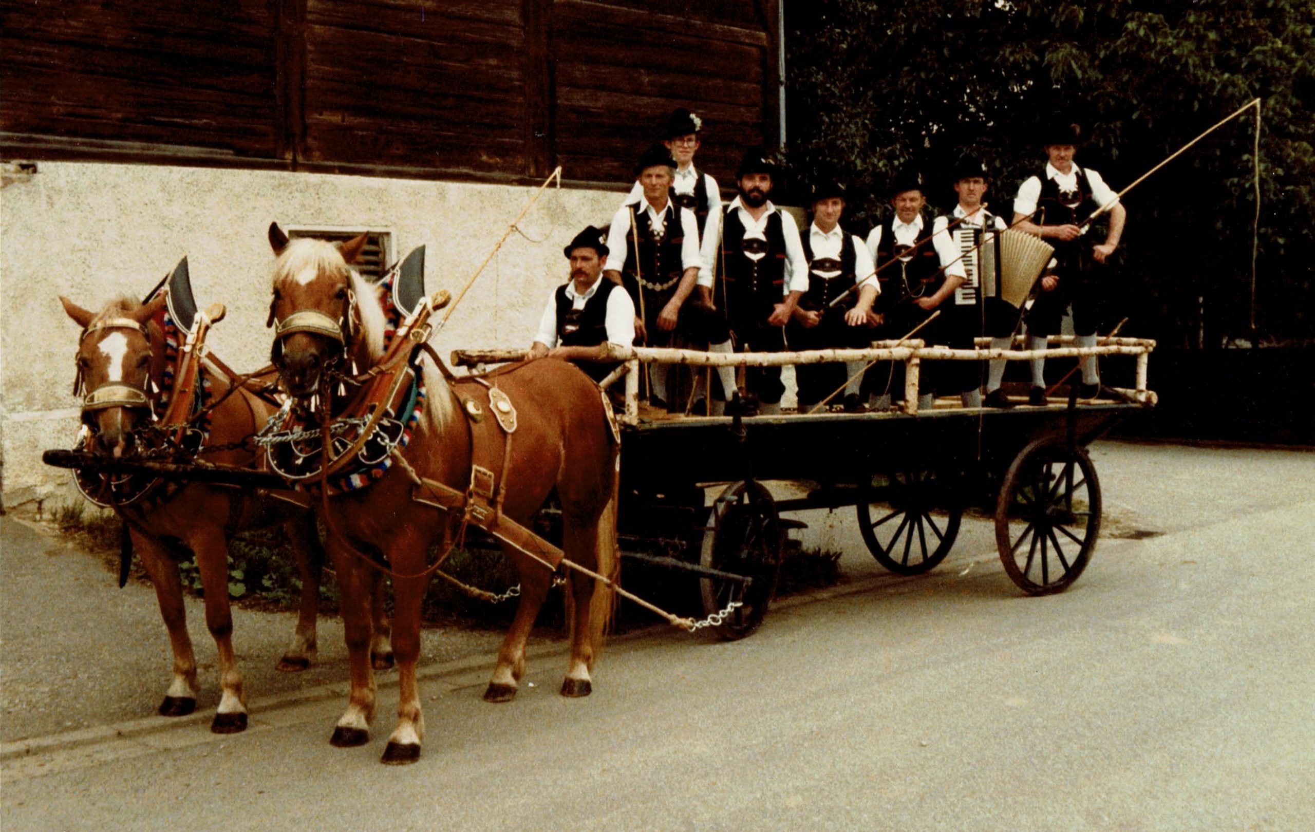 Die Gründergruppe in den Anfangsjahren mit Pferdegespann, Fuhrmann Simon Maier