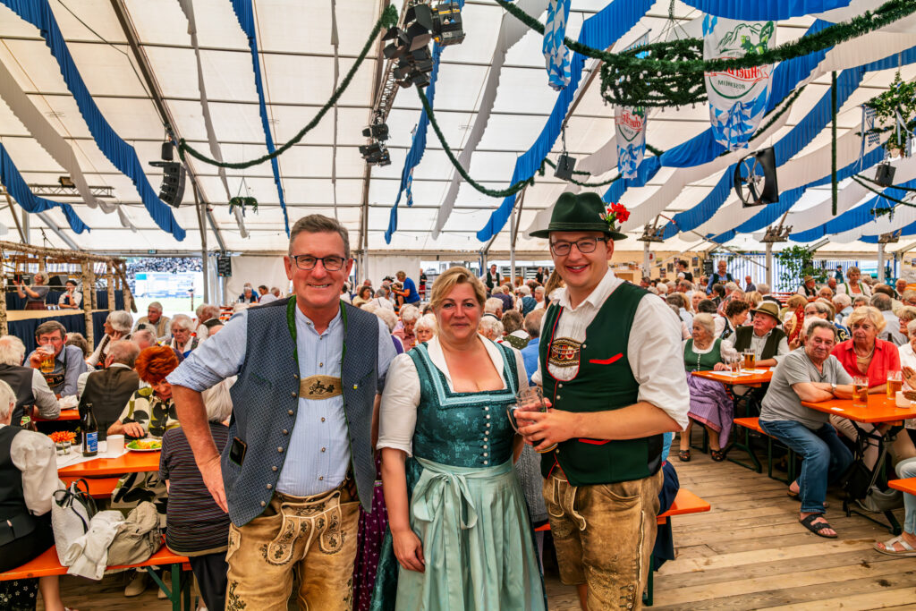 Christoph Schneider (rechts) neben Susanne Grandauer, Bürgermeisterin von Nußdorf und Georg Huber (links), Bürgermeister vom Samerberg beim Senioren-Nachmittag im Festzelt von Altenbeuern