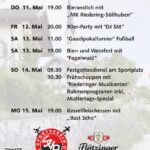 Das 60jährige Bestehen des SV Riedering wird mit einem Festzelt am Sportplatz gefeiert, den Auftakt bildet am Donnerstag, 11. Mai ab 19 Uhr der Bieranstich mit der Musikkapelle Riedering-Söllhuben. Am Freitag, 12. Mai ist 90er-Partyy mit DJ SM und der Samstag beginnt um 11 Uhr mit einem Fußball-Gaudi-Pokal-Turnier und er endet mit einem Bier- und Weinfest mit der Kapelle „Fogelwuid“. Absoluter Höhepunkt werden am Sonntag, 14. Mai ab 9.30 Uhr ein Festgottesdienst am Sportplatz sowie anschließend ein Frühschoppen mit den Riederinger Musikanten sein. Das Rahmenprogramm enthält auch ein Muttertags-Special. Den Abschluss finden die Festlichkeiten am Montag, 15. Mai mit einem Kesselfleischessen zu Flötzinger-Getränken und zu den Klängen der Kapelle „Bast scho“.