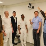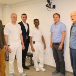Bericht und Fotos: Heinrich Rehberg -„Da oben ist eine von acht neuen Kameras“. Dr. Ulrich Feldmann, der geschäftsführende Vorstand der Hilfswerk Aschau Stiftung für die Orthopädische Kinderklinik (rechts) und der erste Vorsitzende des Stiftungsrats Bürgermeister Peter Solnar (links) übergeben das neue Kamerasystem für das Ganglabor der Orthopädischen Kinderklinik an Chefarzt Dr. med. Florian Paulitsch, den Geschäftsführer des BZ Aschau Simon Leicht, Chefarzt Dr. med. Chakravarthy U Dussa und den Leiter des Ganglabors Dr. Harald Böhm.