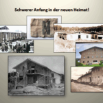 Repros / Fotos: 1. Folie Sudetendeutsch – mit den Bildern (im Kreis rechtsrum) Verladung im Viehwaggon – Armbinde mit “N” für némec (deutsch) – Barackenlager in Haidholzen für viele sudetendeutsche Flüchtlinge/Heimatvertriebene – Bauernhof der Familie Bürger in Weng bei Griesstätt – “Neue Heimat” = Straße mit Neubauten in der Erlenau (Rosenheim), ca. 1959 – Hausbau der Familie Karl und Elisabeth Schwarzer in Haidholzen.