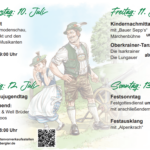 Am Sonntag wird dann der Geburtstag zusammen mit den umliegenden Trachtenvereinen und den Patenvereinen mit einem Festgottesdienst mit anschließendem Festzug gebührend gefeiert. Die Deininger Musi wird uns durch den Tag begleiten und schneidig für die Plattlergruppen der Vereine aufspielen bevor Alpenkrach zum Festausklang einlädt.