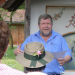 BHM_Volksmusiknachmittag_003.jpg: Ernst Schusser vom Volkmusikarchiv des Bezirks Oberbayern in Bruckmühl stimmt am Kapellenbildstock christliches und besinnliches Liedgut gemeinsam mit den Besuchern an. © Bezirk Oberbayern, Archiv Bauernhausmuseum Amerang.