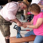 BHM_Sensenmähen_001.jpg: Teilnehmerin und Richard Bals an der Dengelmaschine