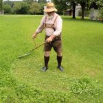 Nach der geselligen Pause und dem vom Museum organisierten Mittagsimbiss geht es zur praktischen Übung auf die Museumswiesen. Die richtige Körperhaltung gibt den Ausschlag für den Erfolg beim Sensenmähen. Doch auch die Freude darf nach Bals nicht zu kurz kommen: „Wer sauer ist, hat wenig Freude am Mähen. Wer froh dabei ist, ist nach zwei bis drei Stunden körperlicher Arbeit rundum zufrieden. Ja, dann ist das Mähen eine meditative Arbeit.“
