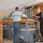 Endlich ist es soweit, die alte Orgel in der Pfarrkirche wurde abgebaut, ein Ereignis, das man selten beobachten kann. Orgelbauer Alois Linder und Uli Skiwan aus Nußdorf sind angereist und haben mit sechs Helfern aus Schleching die Orgel abgebaut. Kein leichtes Unterfangen über die fast 300 Jahre alten ausgetretenen und steilen Treppen der Empore.