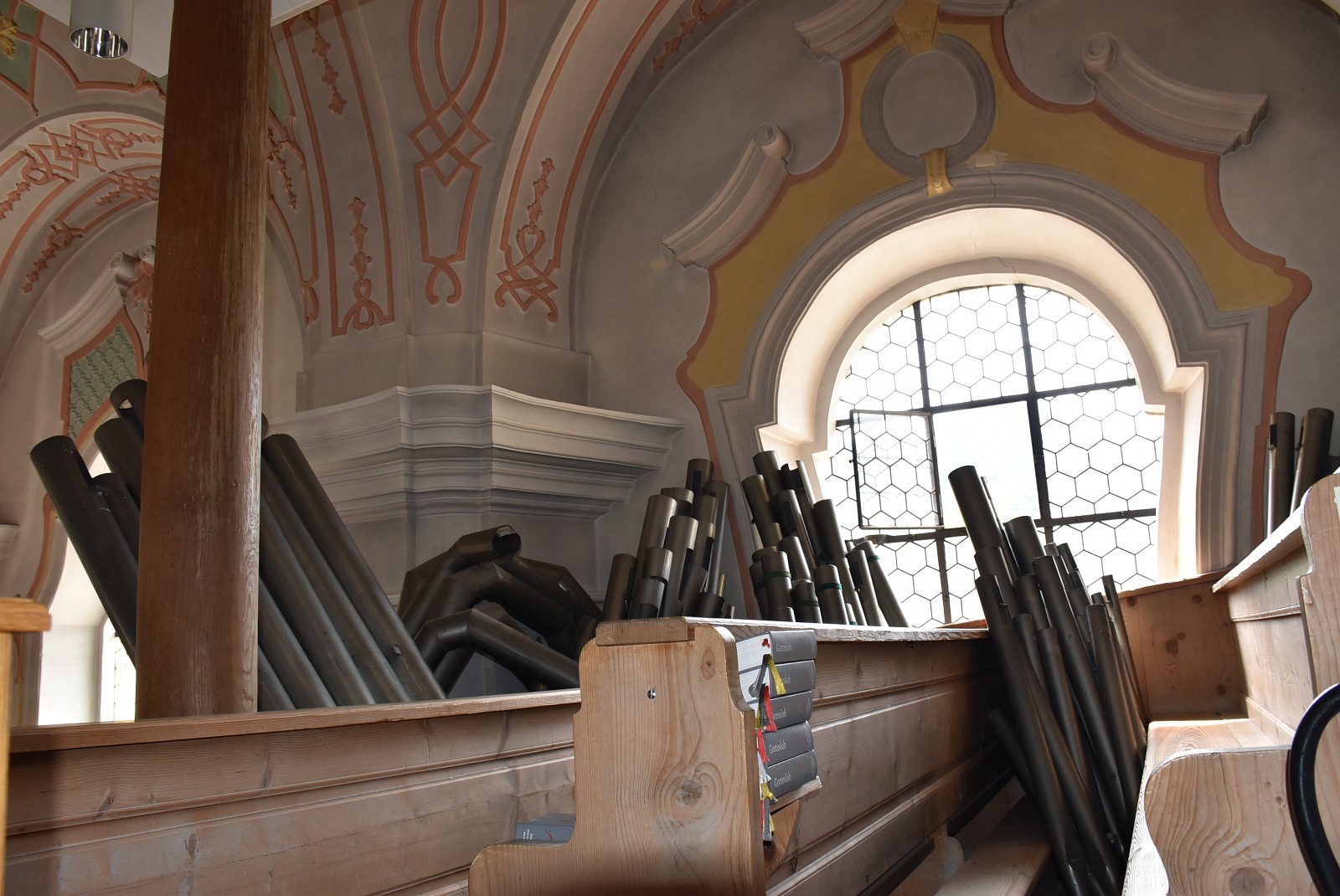 die abgebauten Orgelpfeifen sind schon ein Stock tiefer