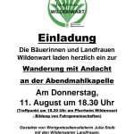 Die Wildenwarter Landfrauen laden am kommenden Donnerstag, den 11. August ein zu einer Wanderung mit einer Andacht an der Abendmahlkapelle in Aschau. Treffpunkt ist um 18.30 Uhr am Pfarrheim in Wildenwart. Die Andacht gestaltet die Wortgottesdienstleiterin Julia Stoib zusammen mit den Landfrauen. Im Anschluss wird in das Cafe Pauli eingekehrt.