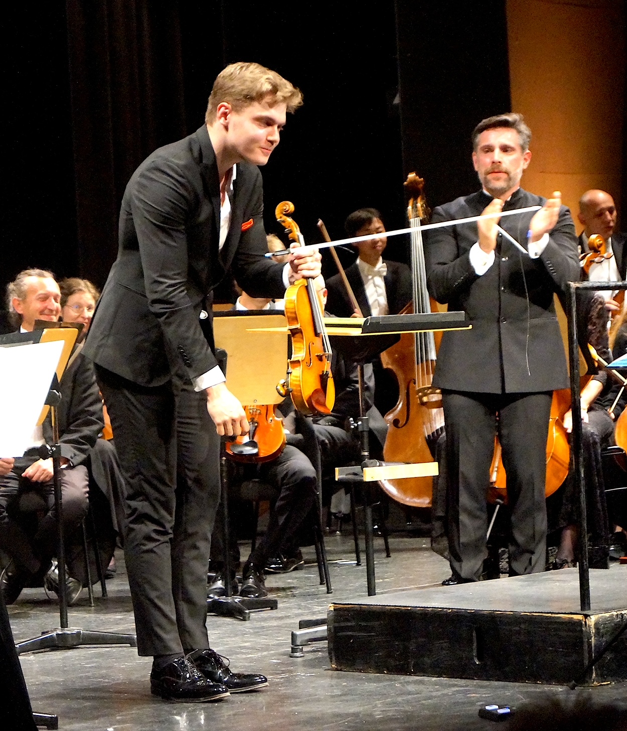 Alle applaudieren mit vollster Begeisterung: der Dirigent, die Musiker und das Publikum.
