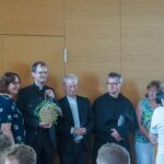 Die passende musikalische Umrahmung der festlichen Freiluft-Messe kam von Kirchenmusiker Andreas Penninger und der Wasner Musi unter der Leitung von Hans Rutz. Die Abschiedsfeier wurde aufgrund der Wetterbedingungen kurzfristig in den bereits dafür vorbereiteten und letztlich bis auf den letzten Platz gefüllten Pfarrsaal im ersten Obergeschoss verlegt. Dort folgte, moderiert von Domkapitular Dekan Monsignore Stadtpfarrer Thomas Schlichting, die Abschiedsfeier. Im Mittelpunkt stand dabei der Blick auf sieben gemeinsame Jahre und der Dank für eine gute Zusammenarbeit von Pfarrvikar und allen Mitarbeiterinnen und Mitarbeitern. Sogar eine „Delegation aus Rom“ (Reinhold Gietl, Veronika Wylezol, Elisabeth Schuch und Michaela Nagel) war hierfür angereist. Ebenso erwiesen ein Chor aus Haupt- und Ehrenamtlichen und die Vorsitzenden der Pfarrgemeinderäte dem Geistlichen die Ehre. Sie überreichten dem beliebten Priester zudem etliche Geschenke. Das fleißige Küchenteam der Stadtteilkirche samt Schankpersonal aus Heilig Blut servierte ein gemeinsames Mittagessen und sorgte für gekühlte Getränke, die angesichts der Hitze heiß begehrt waren.