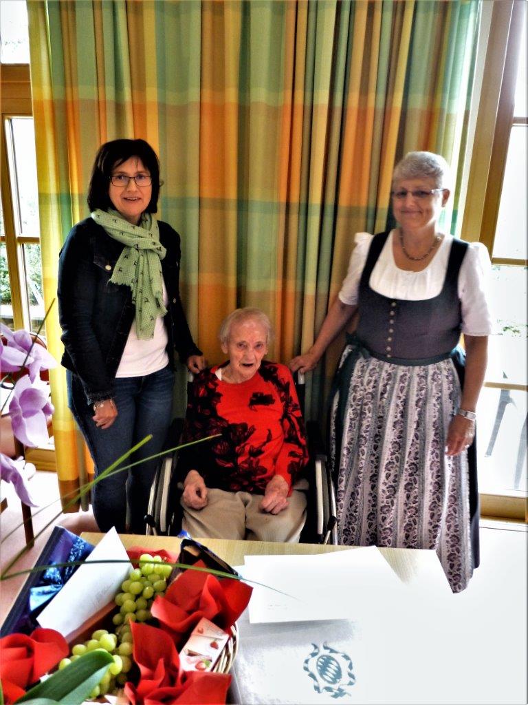 Auch im hohen Alter sitzt Elly Wolf noch gerne im Gemeinschaftsraum und nimmt dort Ihre Mahlzeiten ein. Frau Wolf lebte stets sehr bescheiden. Die Glückwünsche und Geschenke zum 103. Geburtstag überbrachten persönlich die stellvertretnde Landrätin Marianne Loferer und die Dritte Bürgermeisterin Annemarie Braun, die auch die Glückwünsche und das Präsent des Bayerischen Ministerpräsidenten an die Jubilarin übergab.