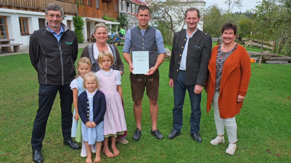 Preisverleihung Agrar-Familie 2021 auf dem Betrieb der Familie Schmid in Grasleiten: v. l. Sepp Kellerer von Bayerischen Landwirtschaftlichen Wochenblatt, Romina und Alois Schmid mit Kindern, Kreisobmann Wolfgang Scholz und Kreisbäuerin Christine Sulzenbacher. (c) BBV/ T.Müller