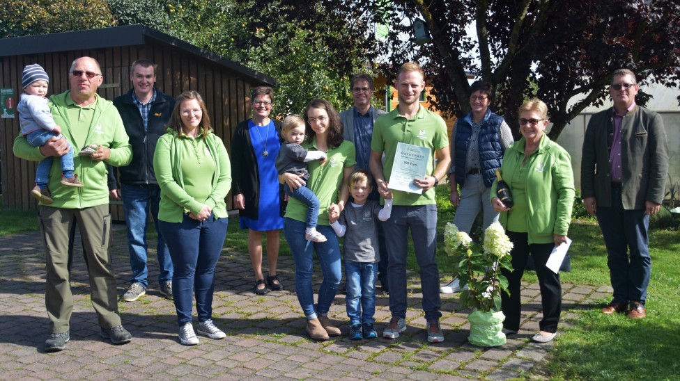 Preisverleihung an Familie Hückl aus Fladungen. Im Bild (von rechts): BBV-Bezirkspräsident Stefan Köhler, Rosi Reinhardt, Kreisbäuerin Margit Ziegler, Christian Hückl mit Sohn Lenny, BBV-Kreisobmann Mathias Klöffel, Anabell Hückl mit Tochter Jule, Bezirksbäuerin Maria Hoßmann, Pius Müller, stellv. Bürgermeister von Fladungen, und Bernd Hückl mit Enkel Moritz. (c) Franziska Sauer