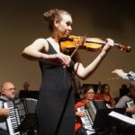 Hoch virtuos und stimmungs oll bot Sophia Nagl den Csárdás von Vittorio Monti dar und spürte dem spannungsvollen Gegensatz zwischen den lyrischen Kantilenen mit Flageolettgriffen und den Prestokaskaden professionell nach. Stefanie Kneidl wurde bei ihrem beeindruckenden Solostück „Tango En Skai“ von Roland Dyens von einem Akkordeonquartett begleitet. Auch sie schuf eine ganz besondere Atmosphäre mit dieser mitreißenden Komposition, bei der sie große Fingerfertigkeit und viel Gestaltungswillen bewies. Jubel und begeisterter Applaus war beiden sicher. Die Melodiephrasen in den Arrangements waren so verteilt, dass beinahe jeder Musiker zum Solisten werden durfte. Ein wunderbares miteinander Verschmelzen erzeugte einen außergewöhnlichen Klang, der immer der jeweiligen Komposition angepasst war.