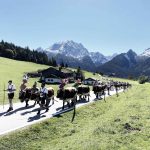 Kälber von der Mordaualm in der Ramsau am vergangenen Sonntag traditionell „aufkranzt“ – also mit Fuikl und Glocken geschmückt. Von der rund 1200 Meter hoch gelegenen Mordaualm ging es bei strahlendem Sonnenschein und schneebedeckten Gipfeln in dreieinhalb Stunden erst hinunter zur Deutschen Alpenstraße, dann hinauf aufs Hochschwarzeck und wieder hinunter nach Bischofswiesen.