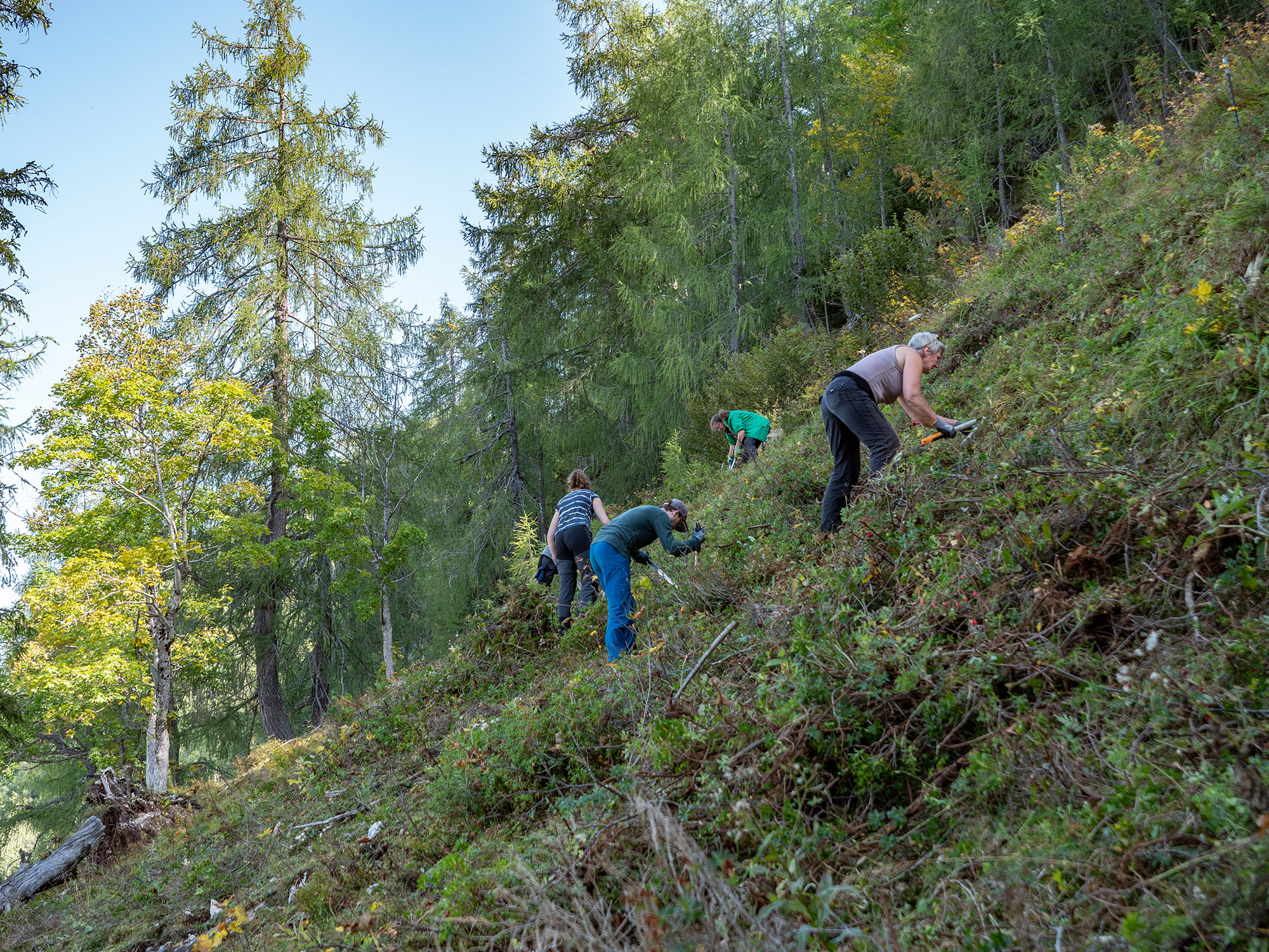 Sie zeigten viel Einsatz – auch im steilen Gelände leistete die Gruppe wirklich tolle Arbeit und unterstützte die Almbauern tatkräftig beim Freihalten der Almflächen. (© Biosphärenregion Berchtesgadener Land)