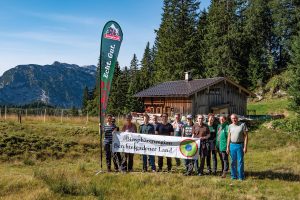 Freiwillige aus der ganz Deutschland nahmen am Camp der Biosphärenregion-Verwaltungsstelle, das dieses Jahr von der Molkerei Berchtesgadener Land unterstützt wurde, teil. Gegen Kost und Logis halfen sie eine Woche lang den Almbauern im Lattengebirge beim Freiputzen der Almweiden. V.r.n.l.: Georg Kronthaler, Verwaltungsstelle der Biosphärenregion BGL; Barbara Steiner-Hainz, Molkerei Berchtesgadener Land; 6. v. r.: Josef Koller, Bergbauer aus Bischofswiesen und Almbauer der Mordaualm. (© Biosphärenregion Berchtesgadener Land)