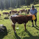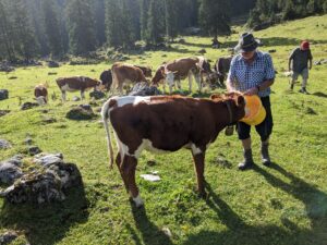 Heute ist es wieder einma soweit. Christoph, der noch nie auf den traumhaft schön gelegenen Almen unterm Watzmann dabei war, darf heute auch mit. Kaum sind wir nach holpriger Fahrt auf schmalen und steilen Almstrassen bei der versteckten Alm angekommen, kommen Manfreds Kälber aus allen Richtungen auf ihren “Herrn” zu, der mehrmals in der Woche nach ihnen schaut und Leckerli mitbringt.