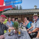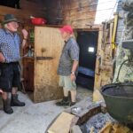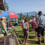 Nach der Besichtigung gehen die beiden zu Fuss zurück zur Stubenalm und wir machen uns auf den Weg zur Mitterkaseralm. Es ist heiss, über 30 Grad, aber es dauert nicht einmal eine Stunde bis zu unserem Ziel und wir löschen unseren Durst mit Bier und Buttermilch. Zahlreiche Wanderer genießen die hier servierten leckeren almtypischen Brotzeiten und Getränke, mit denen sie sich auf dem mindestens 4-5 Stunden dauernden Anstieg von Wimbachbrücke oder vom Königssee über Kühroint bis zum Watzmannhaus stärken. Hans Stocker, der Besitzer (die Alm gehört zum Anötzlehen in Berchtesgaden) ist heute persönlich anwesend und setzt sich zu uns auf einen Ratsch. Auch seine Tochter ist heroben und muss helfen, da die Sennerin heute frei hat. Manfred und Hans tauschen die neuesten Almbauern-Nachrichten aus, dann machen wir uns auf den Rückweg.