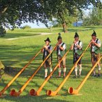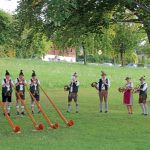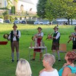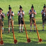 Wie schon in den letzten beiden Jahren hatten auch dieses Jahr die „Hafenstoaner Alphornbläser“ am vergangenen Donnerstag wieder zu einem Konzert eingeladen und fast 150 begeisterte Gäste bei traumhaften sommerlichen Bedingungen in den Bernauer Kurpark gelockt. Das fünfstimmige Ensemble unter der Leitung von Donat Frey gab an diesem Abend, der unter dem Motto „Vom Jodler bis zur Polka“ stand, einen Querschnitt aus seinem Repertoire, mit dabei einige neu erlernte Stücke. In seinen Moderationen erzählte Frey kurze Geschichten, wie es zum Alphornspiel in Bernau kam und beschrieb als langjähriger Alphornbauer sehr genau den Aufbau und die Entstehung des ca. vier Meter langen aus Fichtenholz geschnitzten Instruments. Da keine Ventile oder Klappen vorhanden seien, mit denen man mehr Töne produzieren könnte, kann der Spieler nur etwa 15 unterschiedliche Töne, die sog. Naturtöne, erzeugen. Aus diesem Grund kommt es zu der für Alphörner charakteristische Mehrstimmigkeit, Lieder mit bekannten Melodie zum Mitsingen sind aber meist nicht spielbar. Und so erklangen dann in munterer Folge und bei bester Intonation verschiedene Alphornrufe, Jodler und Polkas oder eine kleine musikalische Szene einer Wallfahrt. Als Zuhörer konnte man richtig spüren, mit welcher Freude und Hingabe die fünf Musikanten bei der Sache waren.