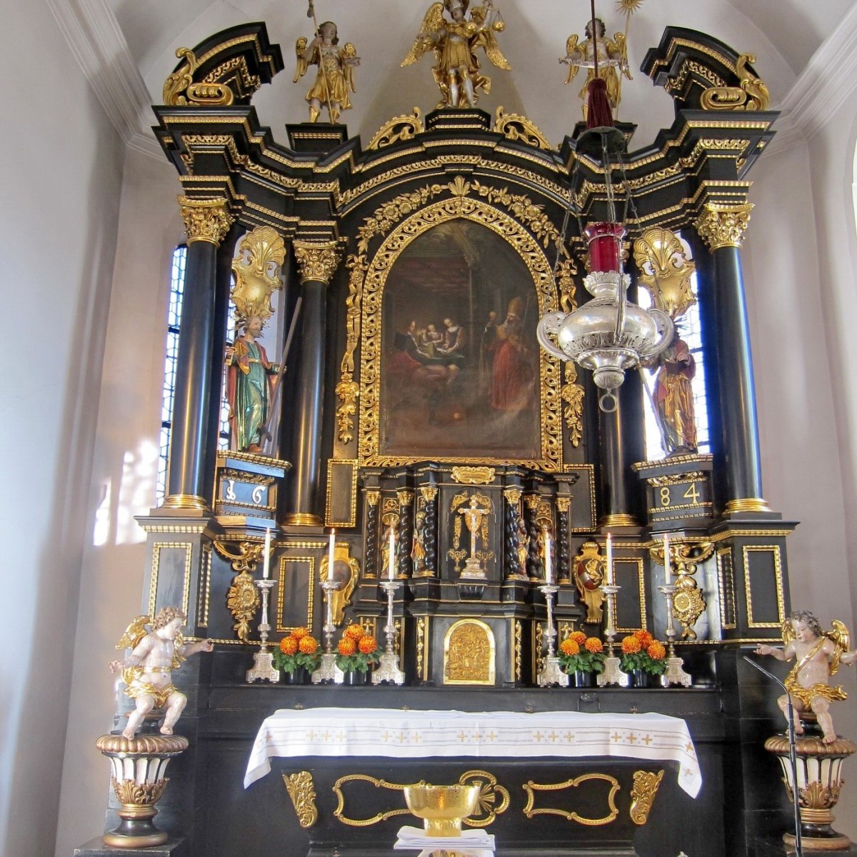 Kirchenpatron St. Nikolaus im Hochaltarbild mit den drei armen Jungfrauen.