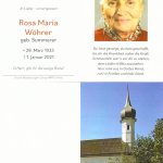 Im Alter von 87 Jahren verstarb Rosa Maria Wöhrer, „Petern-Rosl“ von Urschalling. Coronabedingt konnte die Trauerfeier zusammen mit Pfarrer in Ruhe Andreas Zehetmair und mit Orgelmusik in der Priener Pfarrkirche „Maria Himmelfahrt“ nur im engsten Familienkreise erfolgen.